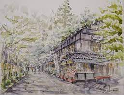 深大寺 お蕎麦で有名な 一休庵 f6 ペン淡彩画 始終曇り空でしたが 最後にほんのり陽が射し込んできたので 迷わず蔭を入れて仕上げました 風景画 深大寺 そば屋 そばまんじゅう 一休庵 ペン彩画 透明水彩 調布 現地写生 清友典一 水彩画 風景 透明